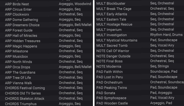 ♫ 40 exclusive sample-based multi-layered Performances – 16 ARPS, 4 Chords, 9 Multis, 4 One-note Sequences and 7 Pads;